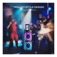 Rechargeable UHF Wireless Microphone : Take centre stage with the built-in rechargeable UHF wireless microphone. To amp up the fun, plug in up to 2 additional wired mics to turn your party speaker into a full-blown karaoke hub.
