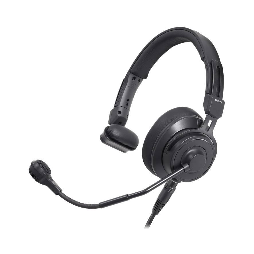 Boom-mounted microphone can be positioned on the left or right side.